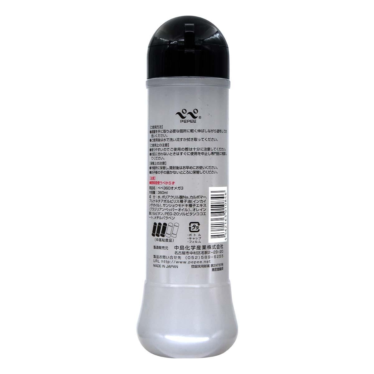 PEPEE 360 Omega 3 水性潤滑劑由日本中島潤滑油品牌研發,擁有超過20年的專業經驗,品質值得信賴。這款中高黏度潤滑液採用水溶性配方,易於清洗,並添加巴西胡椒木籽提取物與印加果籽油,提升感官刺激,特別適合按摩及親密使用。主要成分包括水、卡波樹脂、失水山梨醇油酸酯等,質地溫和且極微香,不刺激皮膚。產品容量達360ml,經濟實惠,滿足長期使用需求。注意:每片安全套僅限使用一次,非陰道性交可能增加滑落或破損風險;目前無任何避孕方式能100%預防懷孕或性病(如愛滋病)。以下是產品亮點: